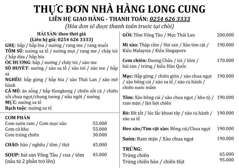 Hải sản theo thời giá, xin quý khách vui lòng liên hệ với chúng tôi. Long Cung Resort phục vụ rất nhiều món ăn Á - Âu, nhiều loại hải sản tươi sống và chất lượng. Hải sản được chế biến độc đáo, hấp dẫn như cháy tỏi, xào sa tế, nướng sa tế, rang me, rang muối, nướng mọi,...