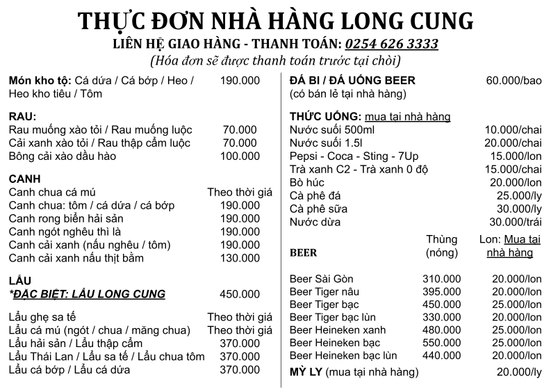 Thực đơn món lẻ tại Khu du lịch Long Cung: